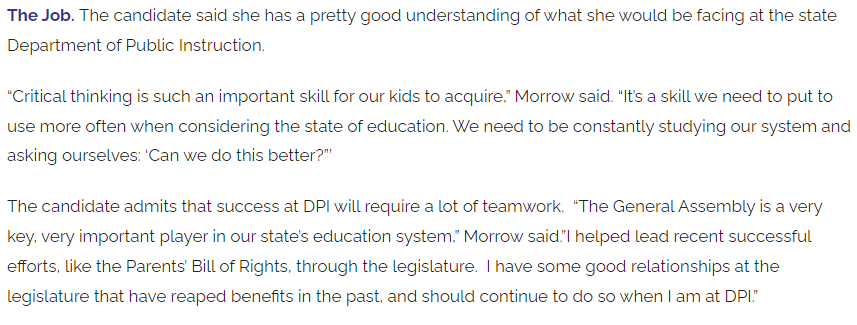 But what Morrow has shown is that she does not have an understanding of how public education works and her past posts on Jim Carrey’s use of adrenochrome from child traffickers, witchcraft in Twix bars, Q-Anon conspiracy theories, and public executions of public officials are not indicative of someone who thinks “outside the box.”