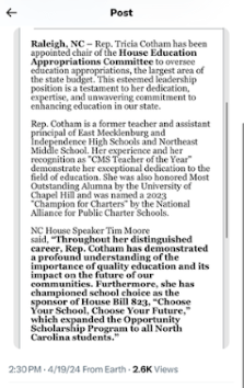 Rep. Tricia Cotham has been appointed chair of the House Education Appropriations Committee to oversee education appropriations, the largest area of the state budget. This esteemed leadership position is a testament to her dedication, expertise, and unwavering commitment to enhancing education in our state.