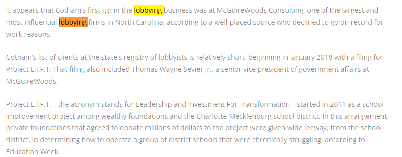 But before Cotham has a chance to rake in money in the “private” sector to “privatize” public education, she gets a few months to be a puppet for Moore in her newly assigned chair.