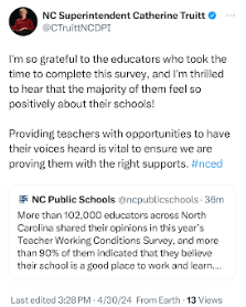 State Superintendent Catherine Truitt’s tweet from today concerning the latest Teacher Working Conditions Survey is worth investigating because it illuminates a rather stark disconnect when it comes to teacher attitudes in working in NC.