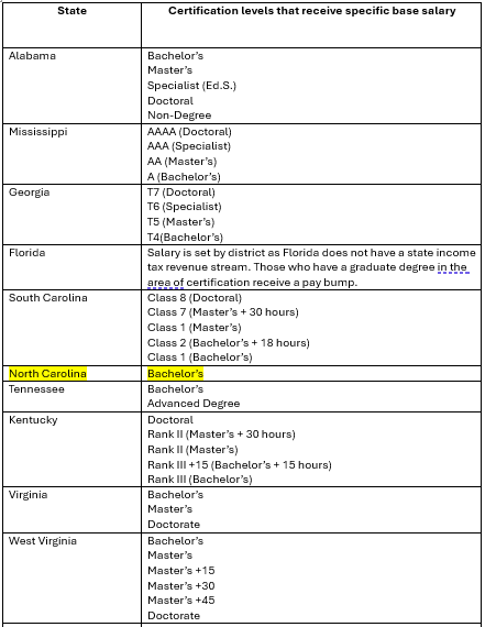 For this particular post, just focus on states that pay teachers more for having a graduate degree beyond a bachelor’s. Let that be yet another way to view how the pathetic decrees from the North Carolina General Assembly have decimated the condition of public education here in NC.