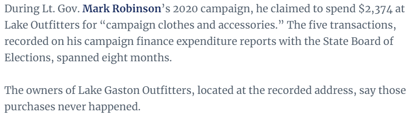The five Lake Gaston Outfitters transactions are part of a larger investigation into Robinson’s 2020 campaign for lieutenant governor. The campaign finance investigation, involving an alleged $500,000 in violations, remains ongoing three and a half years after the initial complaint by Bob Hall, campaign finance watchdog and former editor of Democracy NC.