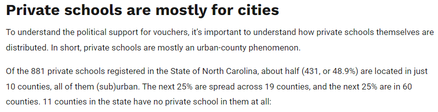 Maybe those rural superintendents have talked to their republican state reps and gave them a very clear view of what would happen in their communities. What the Carolina Forward article argued well was that most of the private schools that exist in the state reside mostly in non-rural areas.
