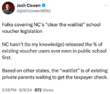 So, when Dr. Josh Cowen, a leading expert on school vouchers, posts this tweet about NC, it begs the question: how many families getting a voucher in North Carolina this year after recent legislation already have been sending their students to private schools?