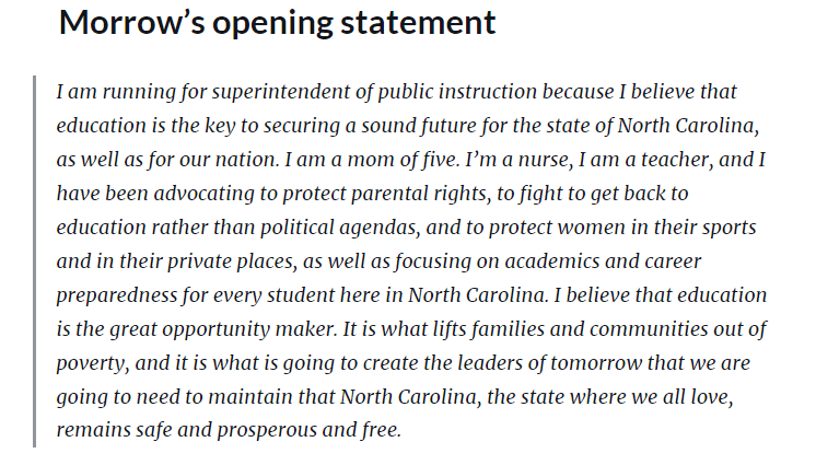 She has never been an actual classroom teacher in schools or served in any capacity within the public school system here in North Carolina.