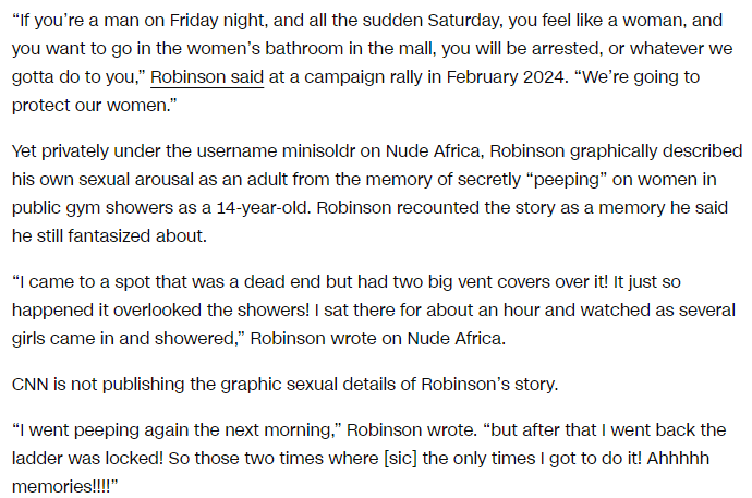 To think that people like Mark Robinson gaslit a culture war on transgender people and which bathroom they should be allowed to use by law and then we get someone like (checks notes)… Mark Robinson who actually likes to “watch” transgender people and also like to peep into the wrong bathroom.