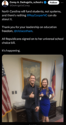 Tricia, you might want to see what is happening with this “champion of school choice” who ran on anti-LGBT platforms with whom you so closely aligned yourself after you created a veto-proof supermajority in the NC General Assembly.