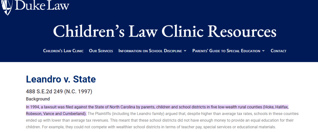 “In 1994, a lawsuit was filed against the State of North Carolina by parents, children and school districts in five low-wealth rural counties (Hoke, Halifax, Robeson, Vance and Cumberland).“