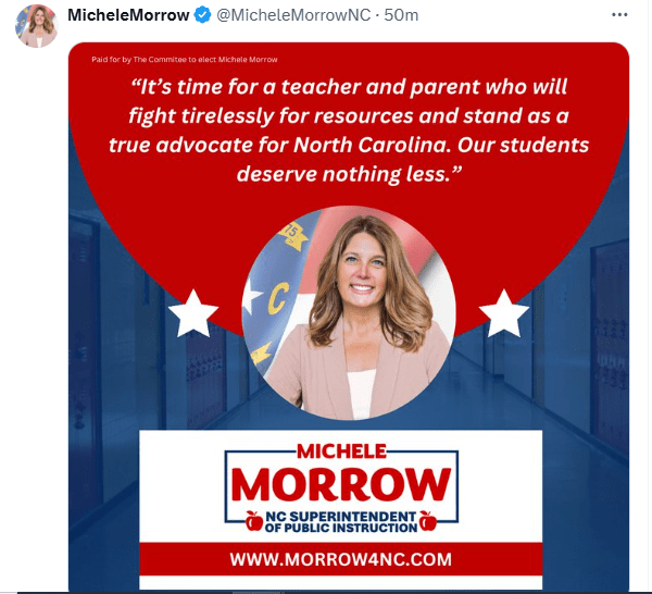 It should read, “I think it’s time for a person who thinks she is a teacher and never sent her children to NC public schools and who will fight tirelessly against the truth that I have absolutely no idea how schools run, operate, or function, and I will stand as a true advocate of conspiracy theories. Your students deserve to submit to my worldview.”