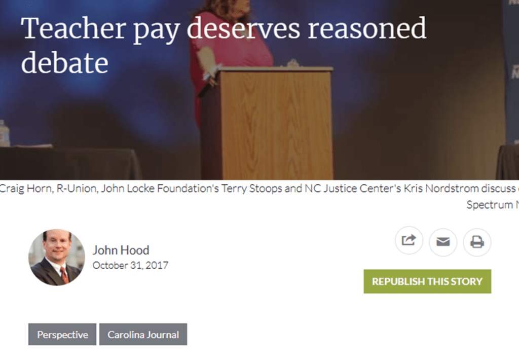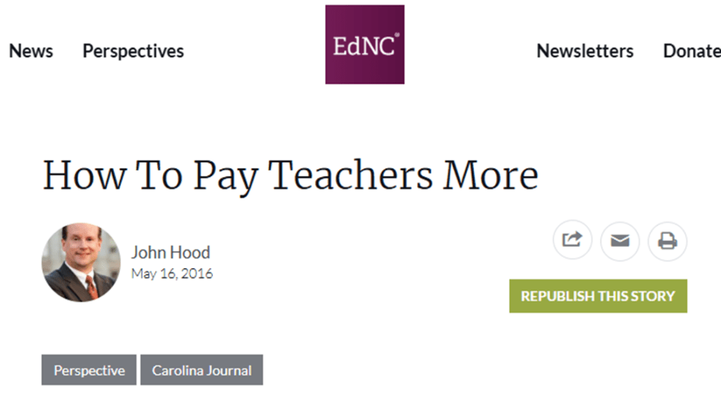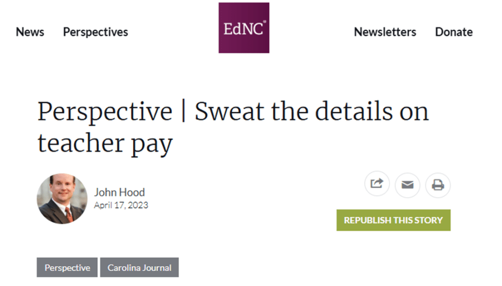 “Teacher compensation is, obviously, a fiscal question. The General Assembly has enacted raises in recent years and needs to do more. But it isn’t only a fiscal question. As the education-reform group BEST NC put it in a recent report, the problem “is not just about how much teachers are paid, but also how that pay is structured.”