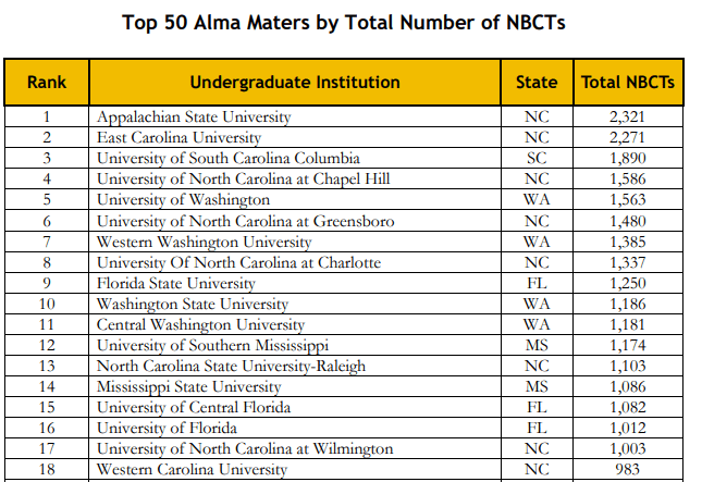 8 of the top 18 alma maters for Nationally Certified teachers in the nation are in North Carolina. All public institutions.