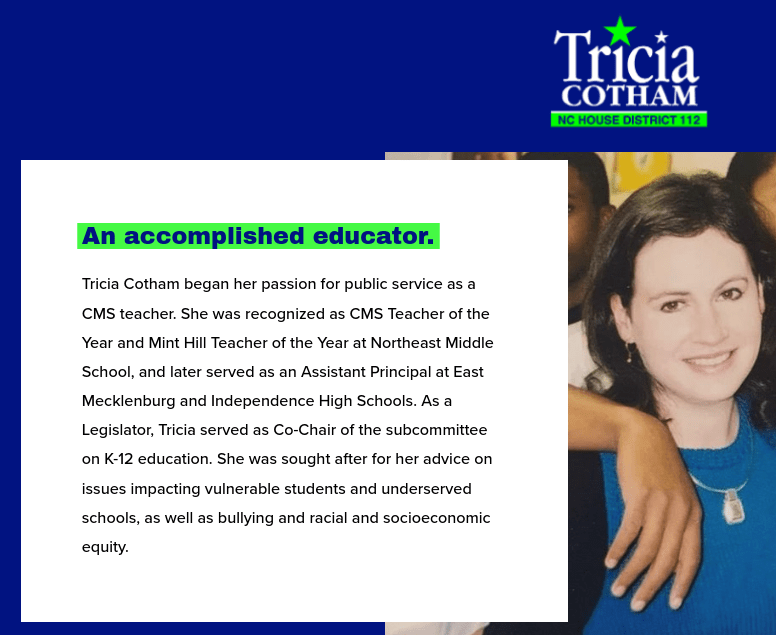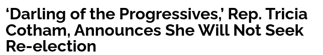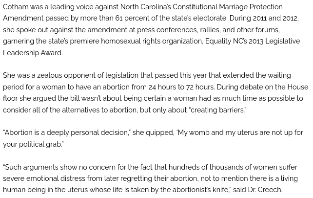 From that same (rather conservative) report, Cotham had been quoted as saying on record and staunchly being on a certain side of issues that make one scratch his head at the switch to another party. (Oh, by the way, she is running again).