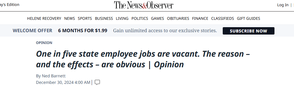 “After years of the Republican-controlled legislature handing out stingy raises and short-term bonuses, state employees’ inflation-adjusted pay has decreased, benefits have eroded and job vacancies have soared.