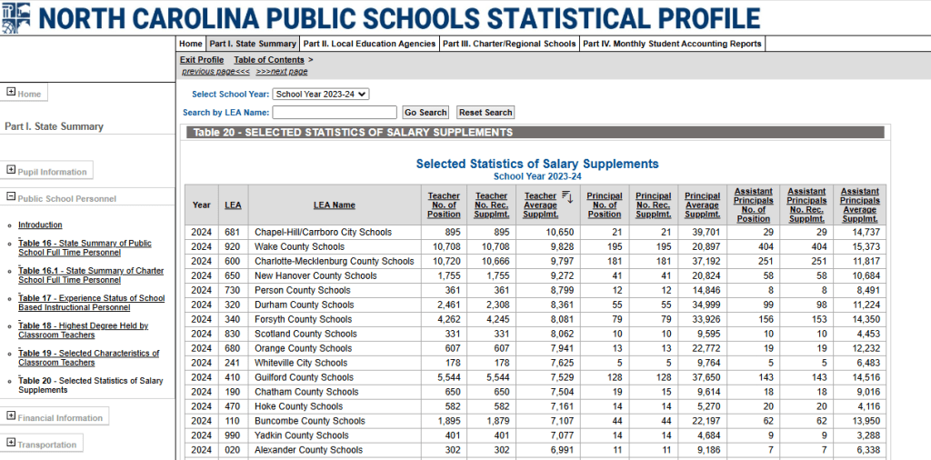 Chapel Hill/Carrboro, Wake County, Charlotte-Meck, and New Hanover all offer local teacher supplements of over $9000. The state average is a little over $6,500.