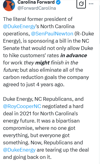 Berger’s bill would eliminate a requirement that Duke reduce its carbon dioxide emissions by 70% before 2030. The bill passed its first committee Tuesday, less than 24 hours after it was filed. Sen. Paul Newton, R-Cabarrus and a former Duke Energy executive, is co-sponsoring the bill with Berger.