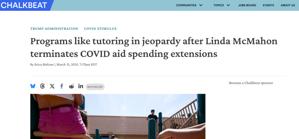 “Those projects and similar ones in schools around the country are now on hold — and states and school districts are on the hook for hundreds of millions of dollars — after Education Secretary Linda McMahon said the U.S. Department of Education would not pay for any more expenses related to pandemic recovery.