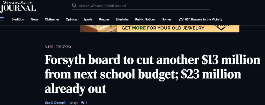 As the headline from the Winston-Salem Journal clearly states, WSFCS schools adopted a budget proposal that already puts next year’s budget $13 million dollars in the red. Those cuts have not been identified and there is no way that schools will not see the brunt of those cuts.