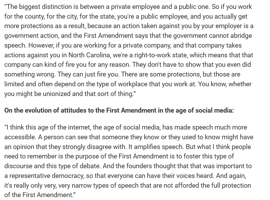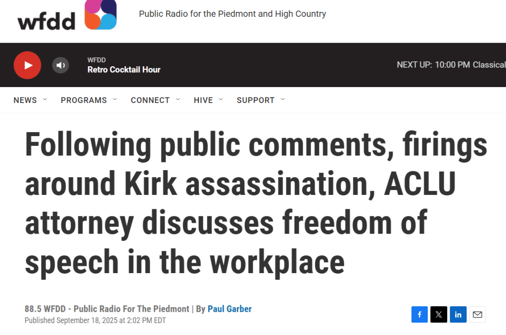 Paul Garber of WFDD (NPR) recently interviewed a lawyer for the ACLU here in North Carolina about free speech rights and how they work in a Right to Work state such as North Carolina.