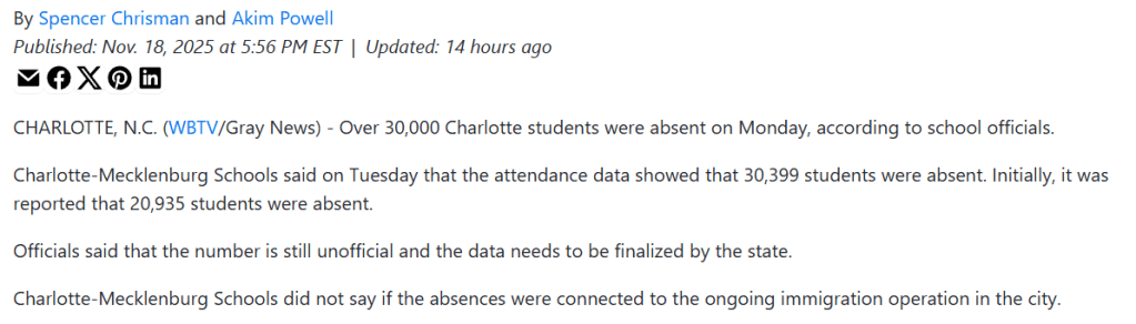 “Charlotte-Mecklenburg Schools did not say if the absences were connected to the ongoing immigration operation in the city.”