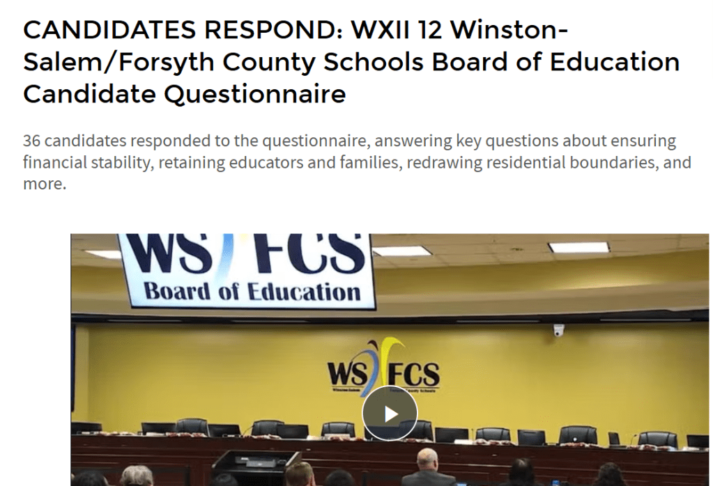 WXII’s Kelly Kendall, an alumna of West Forsyth High School and UNC-Chapel-Hill, has been serving as the primary education reporter for the NBC affiliate located in Winston-Salem and recently published the answers to a candidate questionnaire for those running for the nine seats on the WSFCS Board of Education.