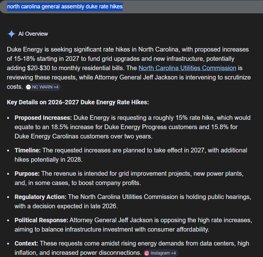Now do a search for “north carolina general assembly duke rate hikes” and see what the initial AI results show.