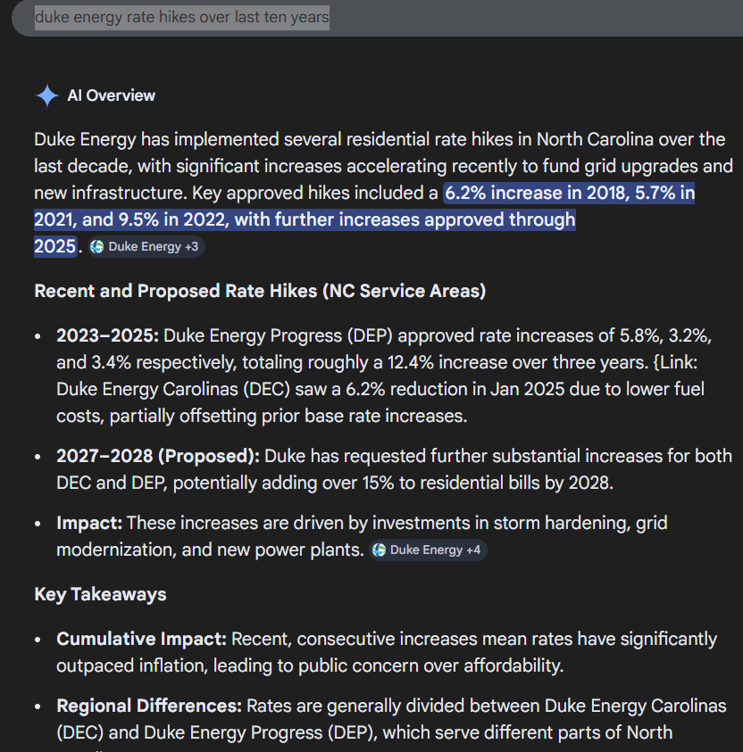 Do a Google search for “duke energy rate hikes over last ten years” and see what the initial AI results show.