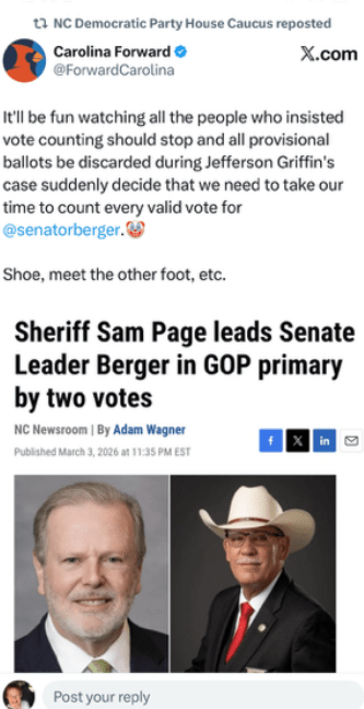 This also brings to mind the Jefferson Griffin – Allison Riggs debacle from last year. With a recount surely to come along and the talk of provisional votes yet to be tallied, it would seem that this primary outcome could be stretched out a bit.