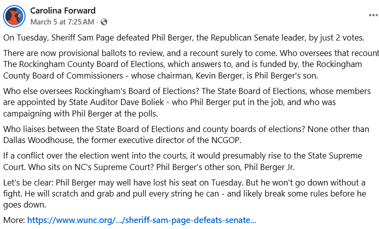 There are now provisional ballots to review, and a recount surely to come. Who oversees that recount? The Rockingham County Board of Elections, which answers to, and is funded by, the Rockingham County Board of Commissioners – whose chairman, Kevin Berger, is Phil Berger’s son.
