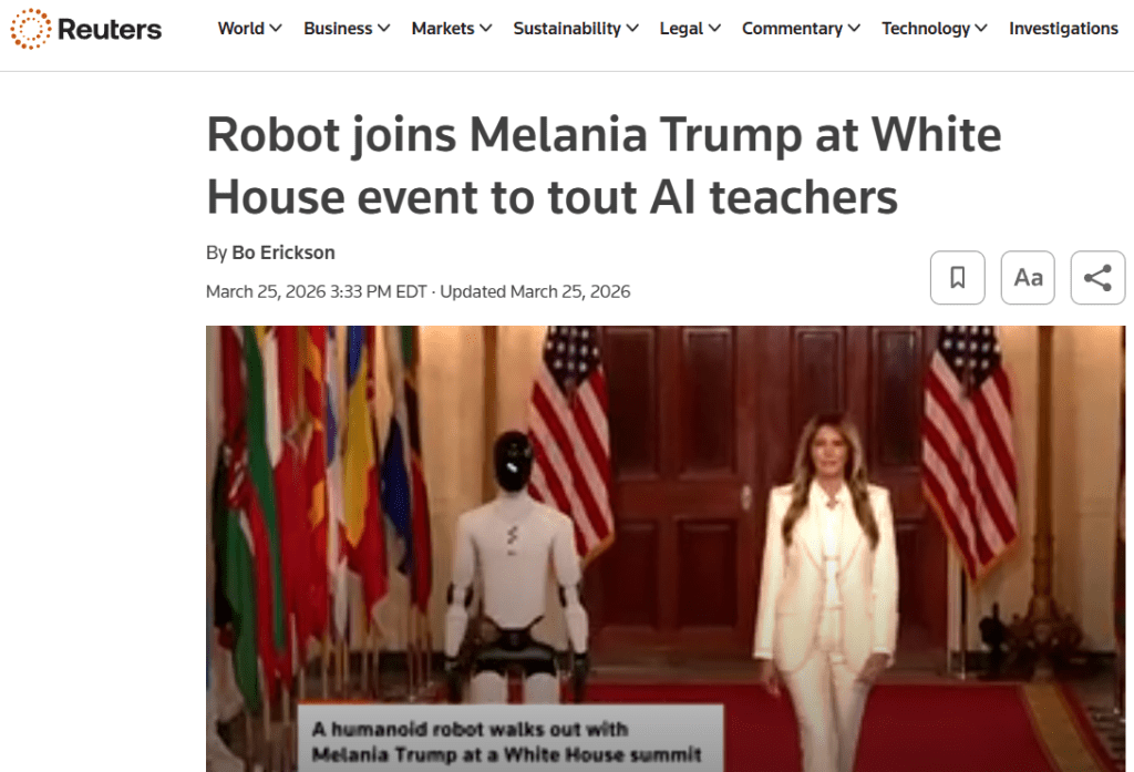 The first lady, a former model, described how in the near future a hypothetical humanoid teacher could quickly access classical studies, mathematics and other subjects to deliver personalized education to students based on their learning speed and “emotional state.”