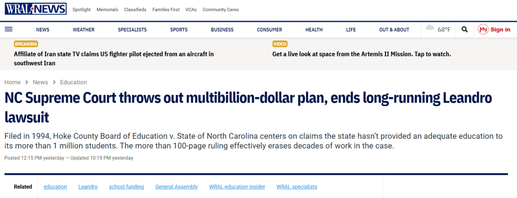 The court threw out that plan Thursday in a 4-3 decision. The ruling invalidates the last decade’s worth of actions in the case. But instead of remanding the lawsuit for further action on the claims of the original five school boards that sued — Cumberland, Hoke, Halifax, Vance and Robeson — the court dismissed the case entirely without giving parties the ability to re-file. Justices in the majority tossed the case in part because they contended that today’s education system has changed too much in the past 20 years and that the lack of any current students as plaintiffs means no plaintiffs have their rights at issue.